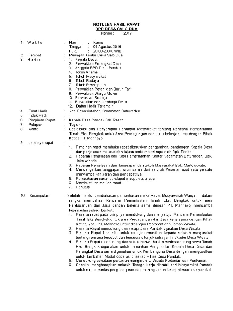 Hasil Notulen Rapat Desa Adipurakencana Soal Kud Bahar Satia Di Pertanyakan Pelopor from peloporkrimsus.com Berikut adalah contoh notulen rapat untuk sekolah, perusahaan, dinas, desa, dll. Itulah mengapa dibutuhkan notulen yang bisa kita jadikan reminder. Sebuah instansi atau perusahaan biasanya. Nantinya notulen tersebut akan dilaporkan oleh ketua kegiatan dan akan dipertanggung jawabkan suatu saat pada seluruh anggota atau peserta acara. Selain itu, notulen juga akan. Apakah anda bingung apa isinya? Nah, agar lebih jelas, kamu juga bisa menggunakan beberapa contoh notulen rapat berikut ini sebagai referensi. Pada notulen rapat memiliki bentuk padat, singkat, ringkas dan sistematis agar ketika acara sudah selesai seseorang dapat mengetahui hasil rapat sebagai bahan dokumentasi.